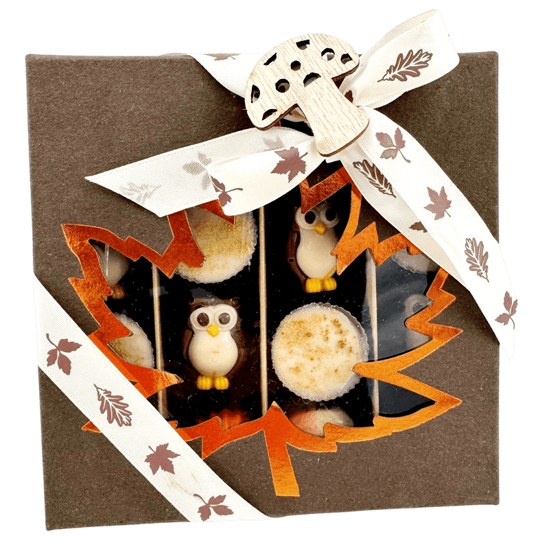 Entdecken Sie unsere herbstliche Pralinenschachtel mit 16 handgefertigten belgischen Pralinen in einer eleganten dunkelbraunen Geschenkbox. Perfekt für saisonale Geschenke oder Verwöhnung.