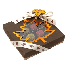 Herbstliche belgische Trüffelmischung in einer dunkelbraunen Geschenkbox