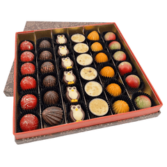 Ingredients: Zucker, Kakaobutter, Kakaomasse, Milchpulver, Haselnuss, Mandel, Sahne, Granatapfelpüree, Glukosesirup, Sorbitol, Butter, Kaffee, Fruchtsaft und Fruchtfleisch (Heidelbeere, schwarze Johannisbeere, rote Johannisbeere), Panela, Kürbisgewürz (Zimt, Muskatnuss, Nelken, Ingwer, Chili, Kardamom), Mandarine, Sonnenblumenlecithin, Bourbon-Vanille aus Madagaskar.