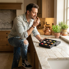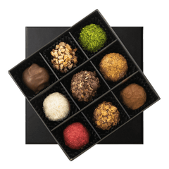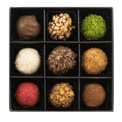 Verwöhnen Sie sich mit unserer luxuriösen Schachtel mit 9 belgischen Schokoladentrüffeln in verschiedenen Geschmacksrichtungen, die in Brüssel mit ethischem Kakao handgefertigt werden. Ein raffiniertes Geschenk oder ein Gaumenschmaus