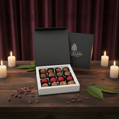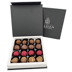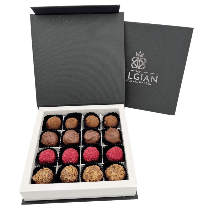 Verwöhnen Sie sich mit unserer Schachtel mit 16 belgischen Schokoladentrüffeln in verschiedenen Geschmacksrichtungen, die in Brüssel aus ethischem Kakao hergestellt werden. Ein raffiniertes Geschenk oder ein Gourmet-Genuss zum Teilen.