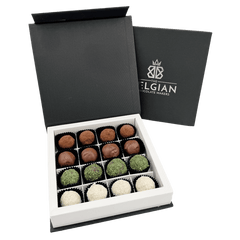 Verwöhnen Sie sich mit unserer Schachtel mit 16 belgischen Schokoladentrüffeln in verschiedenen Geschmacksrichtungen, die in Brüssel aus ethischem Kakao hergestellt werden. Ein raffiniertes Geschenk oder ein Gourmet-Genuss zum Teilen.
