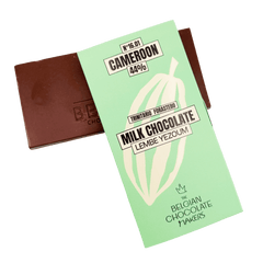 Lembé Yézoum 44% Milchschokolade aus Kamerun, eine exklusive, in Brüssel handgefertigte Tafel aus einem einzigen Ursprung. Eine 100g-Kreation mit raffinierten Noten und außergewöhnlichem Terroir.