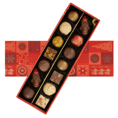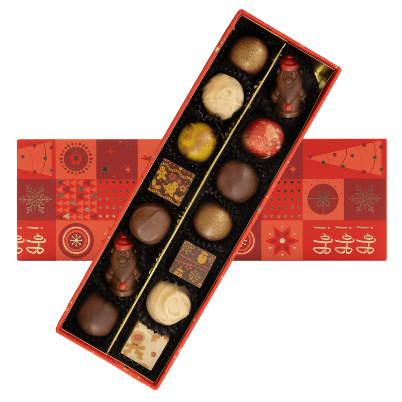 Eine fröhliche Weihnachtsgeschenkbox mit 14 Pralinen und Trüffeln (225g), handgefertigt in Belgien. Unsere Ho-Ho-Ho Edition ist eine köstliche Art, den Zauber von Weihnachten zu teilen.