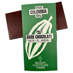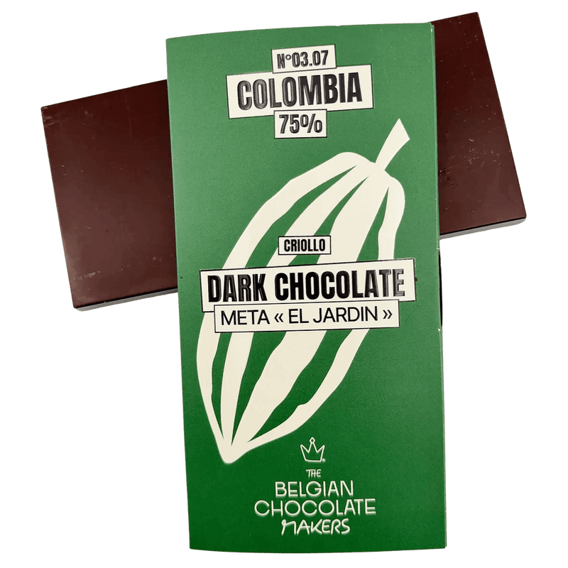 Colombia Meta El Jardín 75% Zartbitterschokolade, eine exklusive Tafel aus einer einzigen Sorte, die in Brüssel handgefertigt wird. Seltener Criollo-Kakao mit raffinierter fruchtiger Eleganz und außergewöhnlichem Terroir.