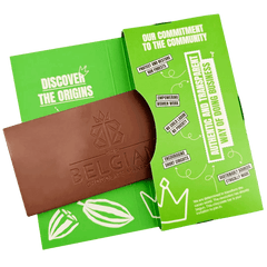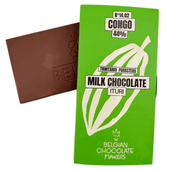 Kongo Ituri 44% Milchschokolade, handgefertigt in Brüssel aus herkunftsreinem Kakao. Ein weicher und cremiger Riegel mit zarten Noten und ethischer Beschaffung.