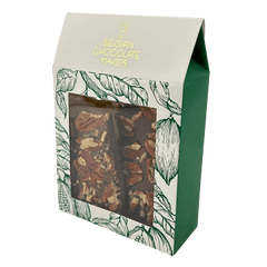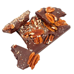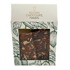 Handgefertigte dunkle Schokoladenbruchstücke mit Pekannuss. Hergestellt mit Premium-Kakao von den Philippinen, bietet eine reiche, fruchtig und nussig Gourmet-Erlebnis.