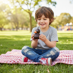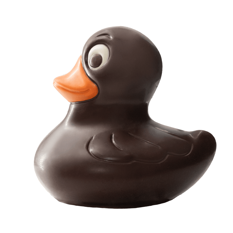 Elegante 75g handgefertigte Ente aus dunkler Schokolade, hergestellt mit feinem Kakao von den Philippinen und sorgfältig in Brüssel verarbeitet, ein reichhaltiger und festlicher Genuss.
