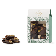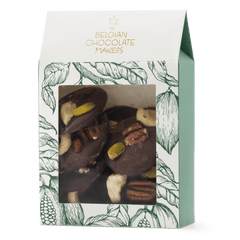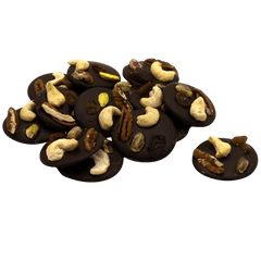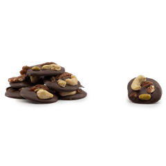 Köstliche 150 g dunkle Schokoladenmendiants mit Cashew-, Pistazien-, Rosinen- und Pekannussstückchen, eine perfekte Mischung aus reichhaltigem Kakao und knusprigem Genuss.