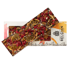 Genießen Sie unsere Fantasy Zartbitterschokoladentafel 375g mit spritziger Himbeere, pikanter Orange und knackigen Mandelsplittern. Ein überdimensionaler belgischer Gourmet-Genuss, perfekt zum Verschenken oder Teilen.