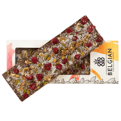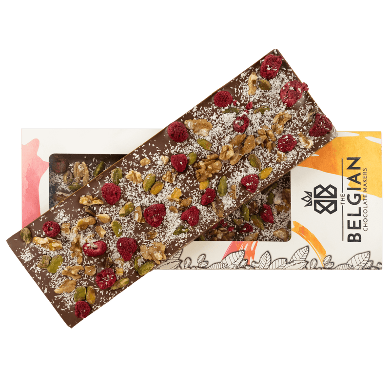 Genießen Sie unsere Fantasy-Milchschokoladentafel 375g mit Walnuss-, Pistazien-, Himbeer- und Kokosnussstückchen. Eine genussvolle belgische Leckerei in Übergröße, perfekt zum Verschenken oder Teilen.