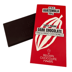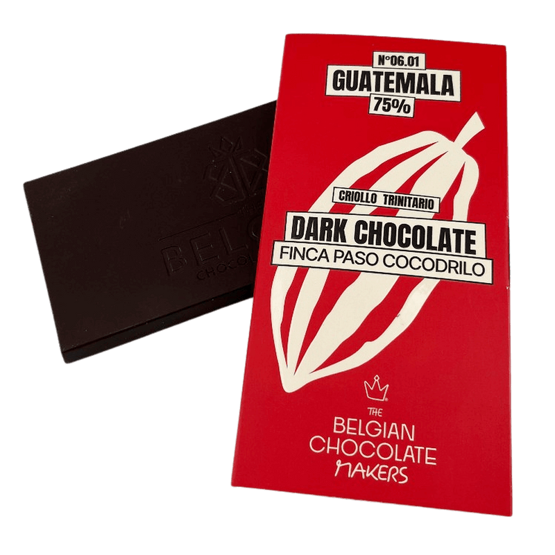 Guatemala Finca Paso Cocodrilo 75% Zartbitterschokolade, eine exklusive, in Brüssel handgefertigte Single-Origin-Kreation. Eine raffinierte Tafel mit eleganter fruchtiger Tiefe und außergewöhnlichem Terroir.