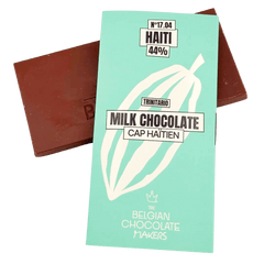Handgefertigte Milchschokoladentafel Cap Haïtien 44%, hergestellt in Brüssel aus haitianischem Kakao aus einer einzigen Quelle. Eine 100g Tafel mit weicher Textur und raffinierten Geschmacksnoten.