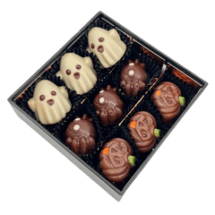 Genießen Sie Halloween mit unserer Schachtel mit 9 handgefertigten belgischen Pralinen (135 g). Hergestellt aus hochwertigem Kakao, ist dieses gruselige Schokoladengeschenk perfekt zum Teilen oder um sich selbst zu verwöhnen.