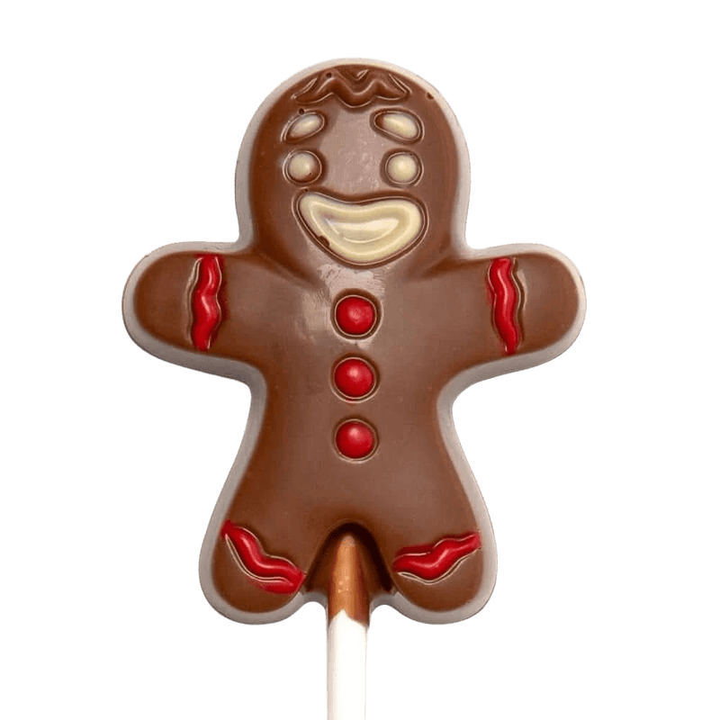 Meet Mr. Ginger! Ein köstlicher Milchschokoladenlutscher, handgefertigt in Brüssel mit erstklassiger belgischer Schokolade, der perfekte festliche Leckerbissen für ein winterliches Lächeln.