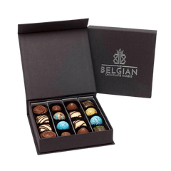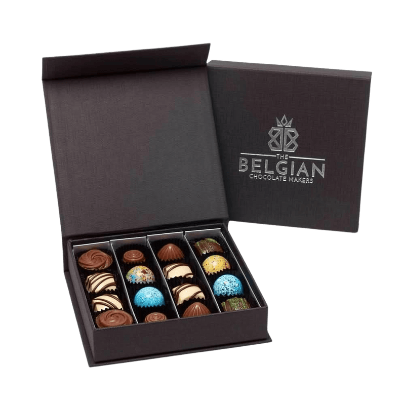 Verwöhnen Sie sich mit unserer luxuriösen Schachtel mit 16 belgischen Schokoladenpralinen in verschiedenen Geschmacksrichtungen, die in Brüssel aus ethischem Kakao handgefertigt werden. Ein raffiniertes Geschenk oder ein Gaumenschmaus