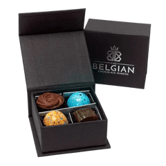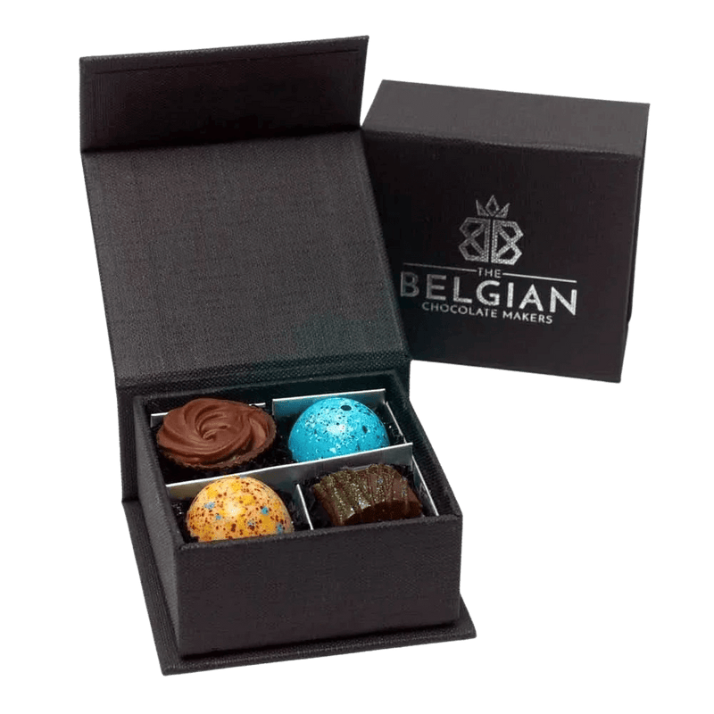Verwöhnen Sie sich mit unserer luxuriösen Schachtel mit 4 belgischen Schokoladenpralinen in verschiedenen Geschmacksrichtungen, die in Brüssel aus ethischem Kakao handgefertigt werden. Ein raffiniertes Geschenk oder ein Gaumenschmaus