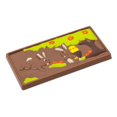 Genießen Sie unsere 120 g schwere Ostertafel aus Vollmilchschokolade, die in Belgien in Handarbeit aus erstklassigem Kakao hergestellt wird. Eine reichhaltige und elegante Kreation, die den Geist von Ostern in jedem Bissen einfängt.