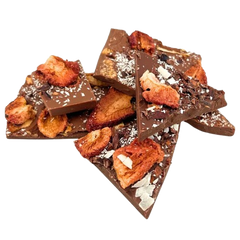 Handgefertigte Milchschokoladenbruchstücke mit Kokosnuss, Erdbeere und Kakaonibs. Hergestellt mit feinem Kakao aus Haiti, liefert einen weichen, fruchtigen und nussigen Gourmet-Genuss.