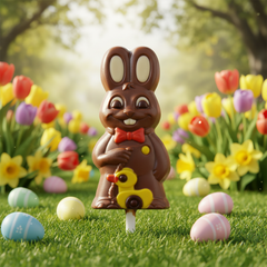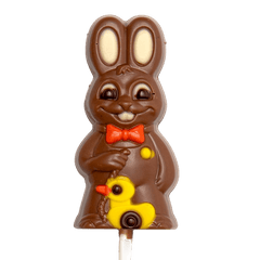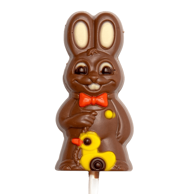 Handgefertigter Milchschokoladenhase mit Spielzeuglutscher, eine lustige und köstliche handwerkliche Leckerei, perfekt für das Osterfest.
