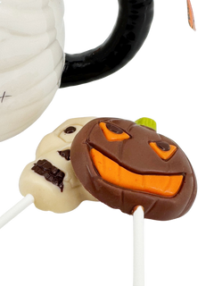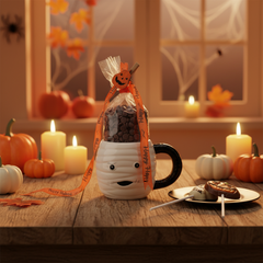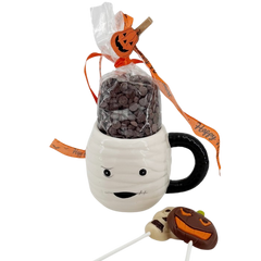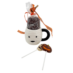 Gruselig und lecker! Unsere Mumien-Tasse ist mit cremigen belgischen Milchschokoladentropfen und lustigen Lutschern gefüllt. Ein perfektes Halloween-Geschenk für Kinder und Schokoladenliebhaber.