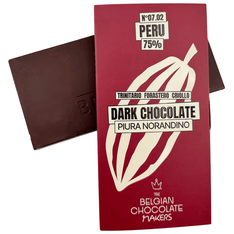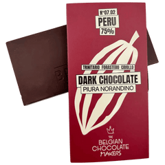 Peru Piura Norandino 75% dunkle Schokolade, handgefertigt in Brüssel aus herkunftsreinem Kakao. Ein seltener Riegel mit zartfruchtigen Noten und raffinierter Eleganz.
