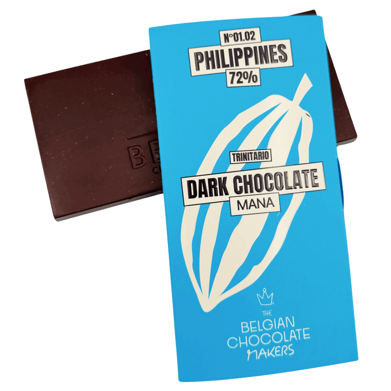 Philippinen Mana 72% Zartbitterschokolade, eine exklusive, in Brüssel handgefertigte Tafel aus einer einzigen Sorte. Seltener Kakao mit raffinierten tropischen Noten für ein wirklich elegantes Geschmackserlebnis.