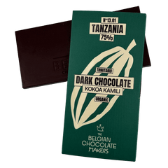 Tansania Kokoa Kamili 75% Zartbitterschokolade, handgefertigt in Brüssel aus sortenreinem Kakao. Eine lebendige Tafel mit hellen Zitrusnoten und raffinierter Komplexität.