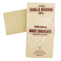 Handgefertigte weiße Schokoladentafel mit Bourbon-Vanille 35%, hergestellt in Brüssel. Eine 100g Kreation, die sanfte Süße und raffinierte Gourmet-Eleganz kombiniert.