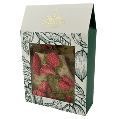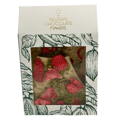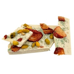 Handgefertigter Riegel aus weißer Schokolade mit Erdbeeren und Pistazien, der cremige Süße mit fruchtigem Knuspern verbindet.