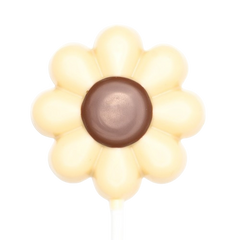 Handgefertigter Blumenlutscher aus weißer Schokolade, 20g. Eine zarte und charmante Leckerei aus weicher Kakaobutter, perfekt zum Verschenken oder zum Genießen als süßer Happen.