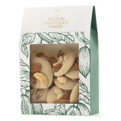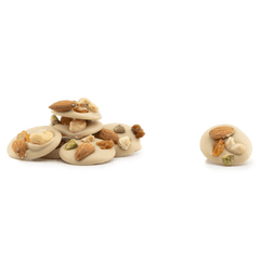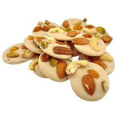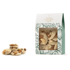 Köstliche 150 g weiße Schokoladenmendiants mit Pistazien-, Mandel-, Rosinen- und Cashew-Stückchen, eine perfekte Mischung aus reichhaltigem Kakao und knusprigem Genuss.