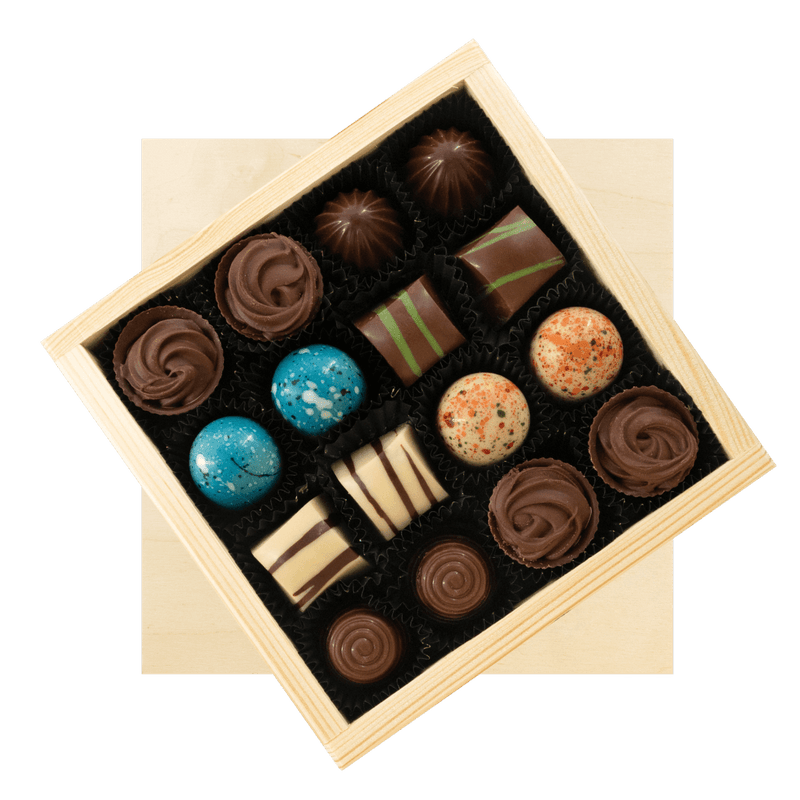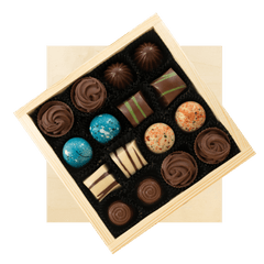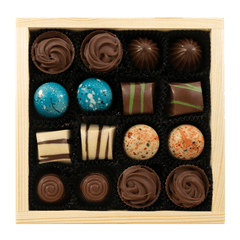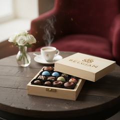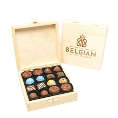 Kaufen Sie unsere Geschenkbox aus Holz mit 16 belgischen Pralinen (240g). Handgefertigte Pralinen aus Brüssel, die perfekte Gourmet-Geschenk-Box für Schokoladenliebhaber.